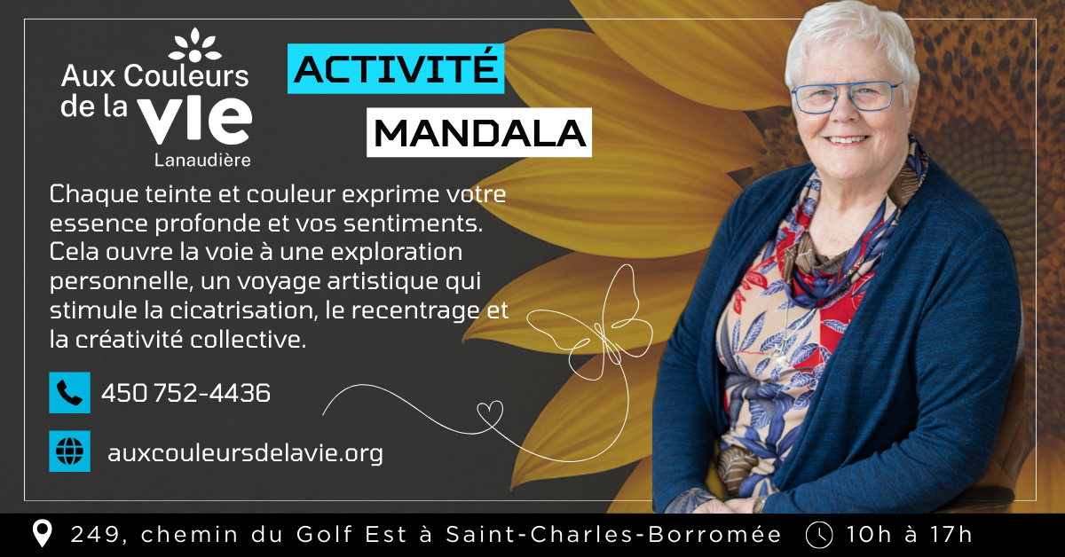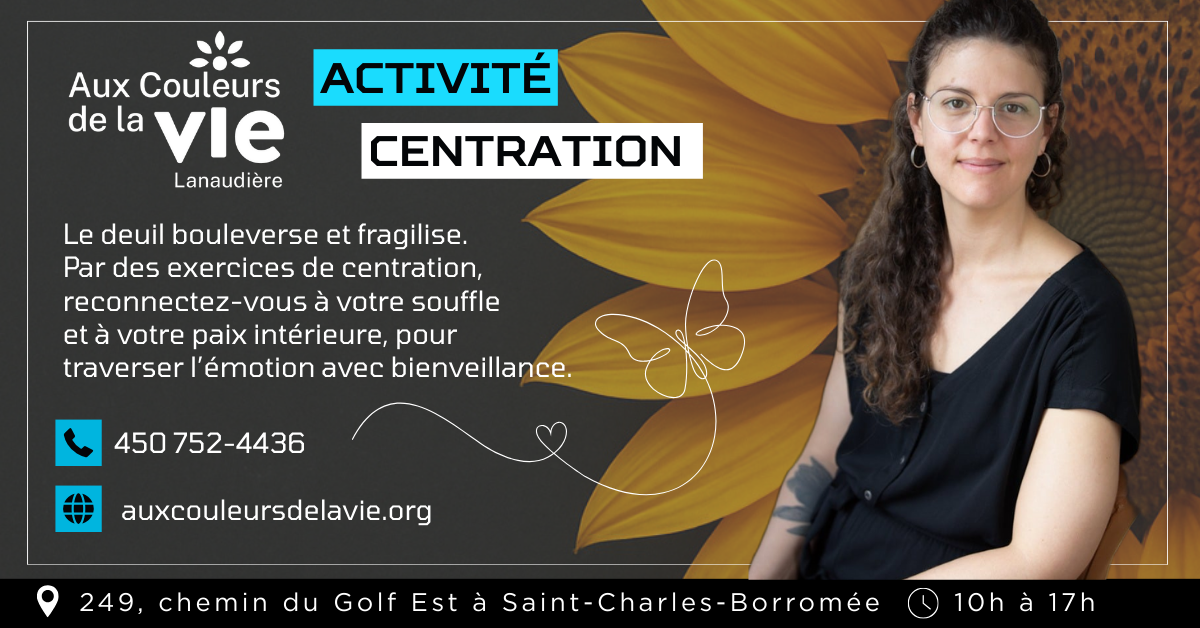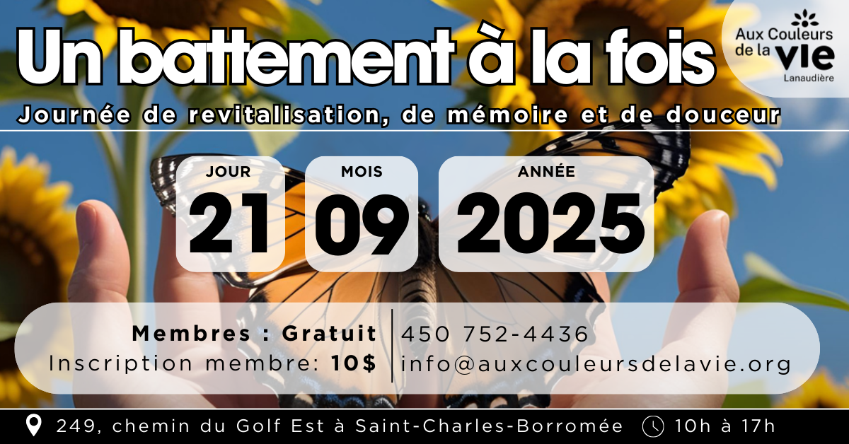 Joliette, 22 juillet 2025 — L’organisme Aux Couleurs de la Vie Lanaudière tiendra, pour la toute première fois, une journée complète d’activités, le 21 septembre 2025, de 10h à 17h. Cette initiative vise à offrir un espace de ressourcement, de partage et de reconnexion, dans un esprit de soutien au deuil, à la perte et aux grandes transitions de vie.